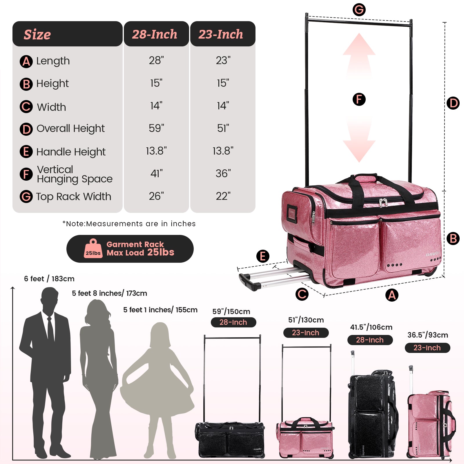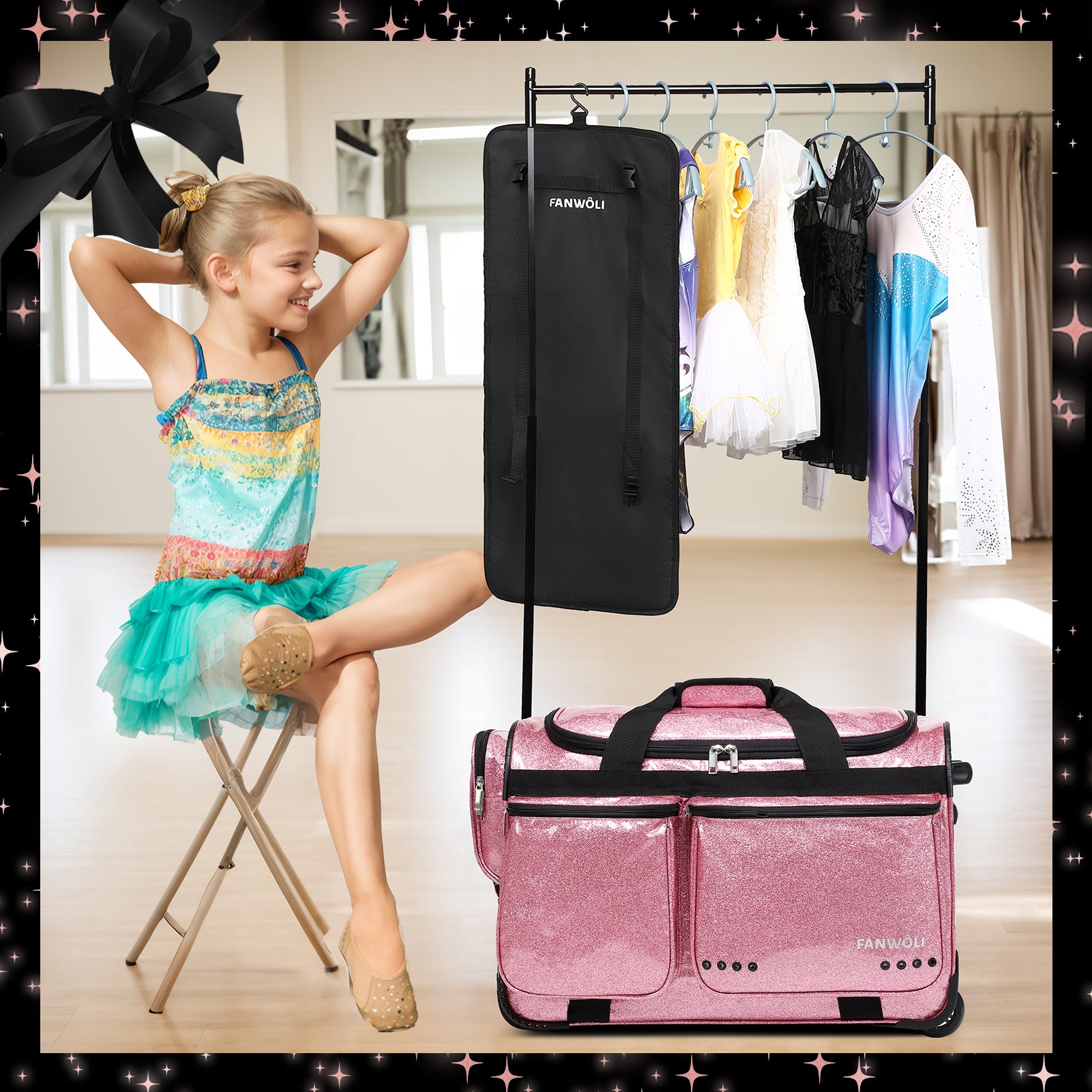 Fegat 28" Dance Bag with Garment Rack,Upgraded Collapsible Glittering Rolling Competition Dance Duffle Bag Lightweight Wear-Resistant Costume Wheeled Suitcase for Dancers Shows,Black