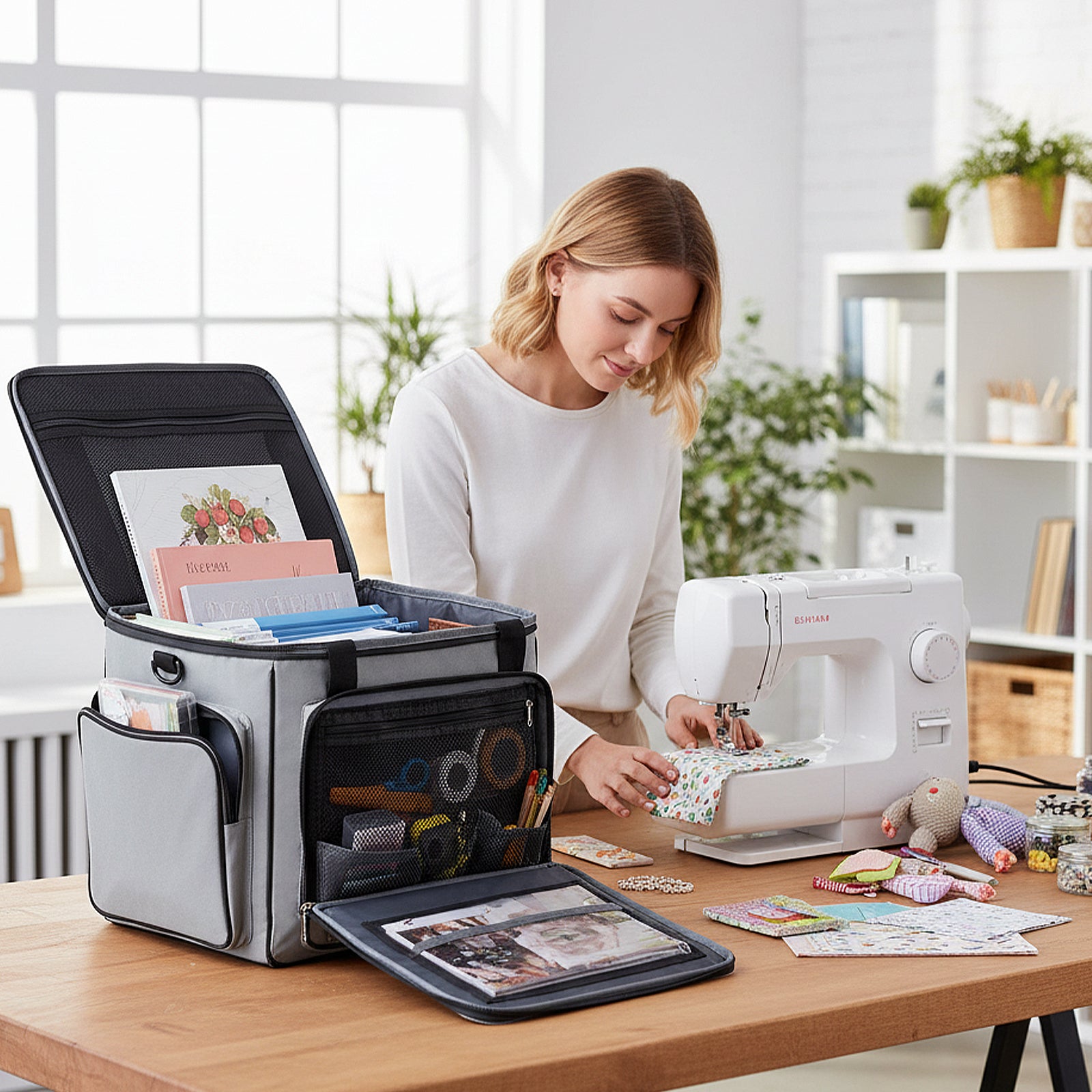 Tired of juggling heavy supplies every time you head to class, a craft fair, or work? Made with tough 900D waterproof fabric and a secure 5-wheel system, this rolling craft bag glides effortlessly anywhere while keeping everything inside safe and dry. No more digging for supplies: the clear PVC label pocket, multiple organizers, and Velcro-stabilized bottom give everything a place—even your sewing machine or laptop. Use the top handles for lifting, the detachable shoulder strap for hands-free carrying, or attach it to the trolley for easy rolling—ideal for commutes, classes, and craft fairs.