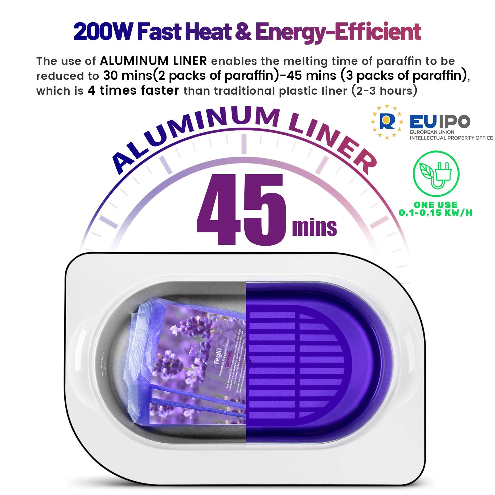 200 W Fast Heating and Melting in 45 Minutes:200 W high-performance and aluminium liner allow you to melt 3 x 450 g paraffin in about 45 minutes, 4 times faster than conventional paraffin bath for hands and feet.