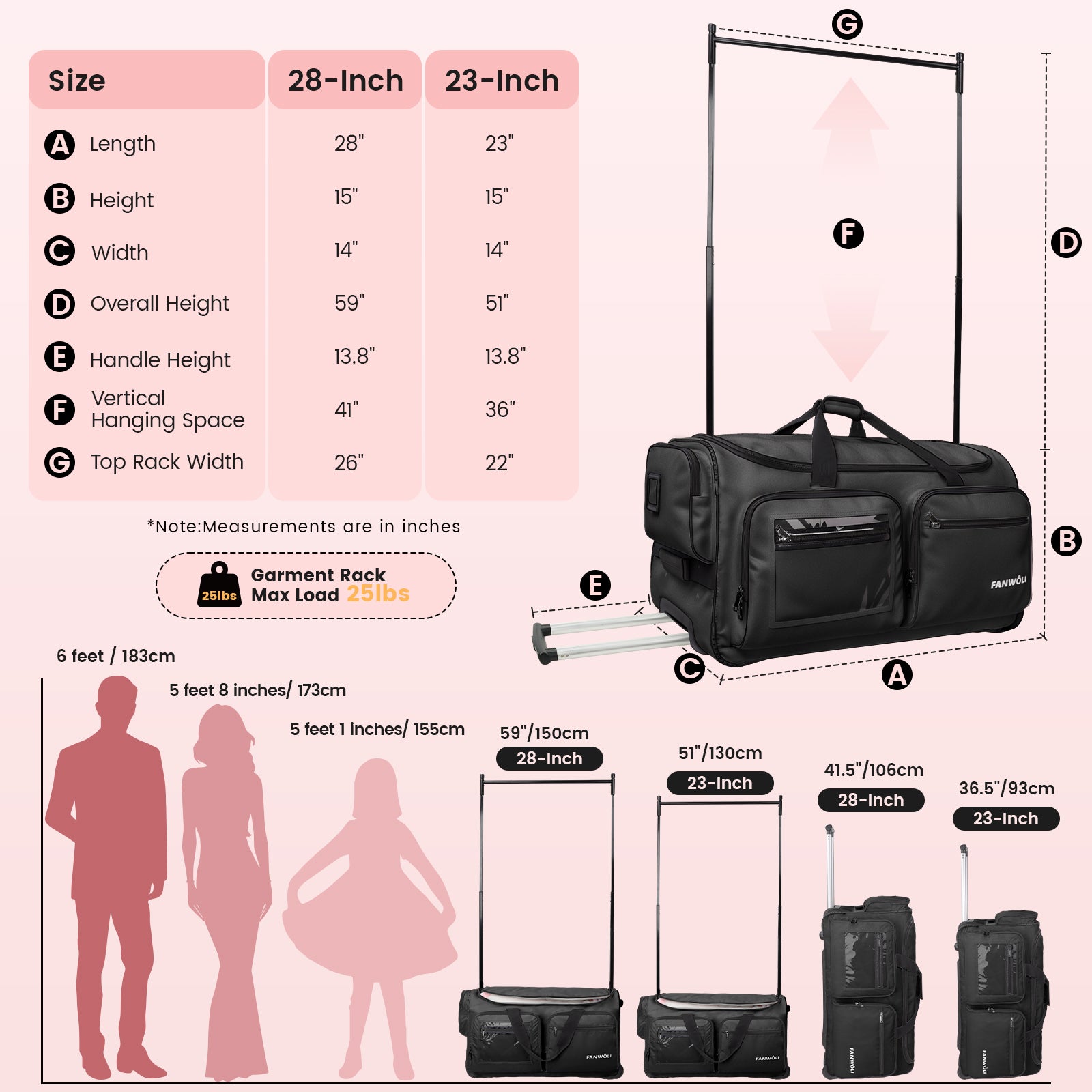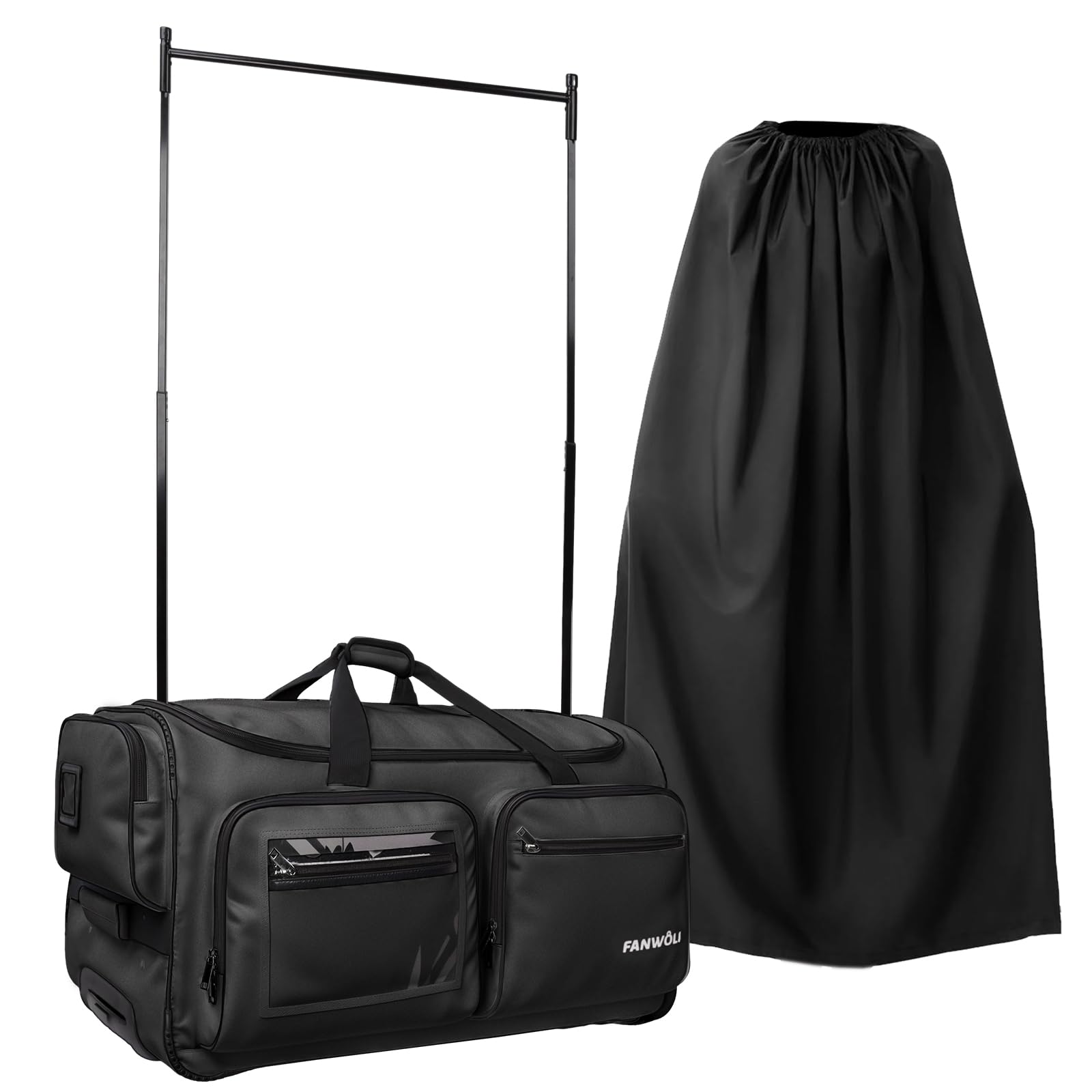 Fegat is building your portable closet for dance competitions, business trips, and other people who need to change multiple outfits!This professional dancer favorite rolling dance bag with garment rack with Dual-Level aluminum alloy handle and silent wheels makes participating in performances and competitions in one city after another seriously easy.Keep all your dance essentials organized in one place with this garment bag for travel. Don't let the hassle of transporting dance gear slow you down. Dancers should focus their time on the stage and their dreams.Champions are always won by those who are more prepared.Not only a professional dance competition bag for adults and kids, but also a portable wardrobe for athletes, film performers, event planners, and others who need to change multiple sets of clothing during work.Multiple exterior and interior pockets provide you with lots of room to fit all your travel needs.Whether you're out and about for a variety of races, visiting friends and family far away, or traveling for business, this dance bag with garment rack creates the pop-up closet you need for any destination.