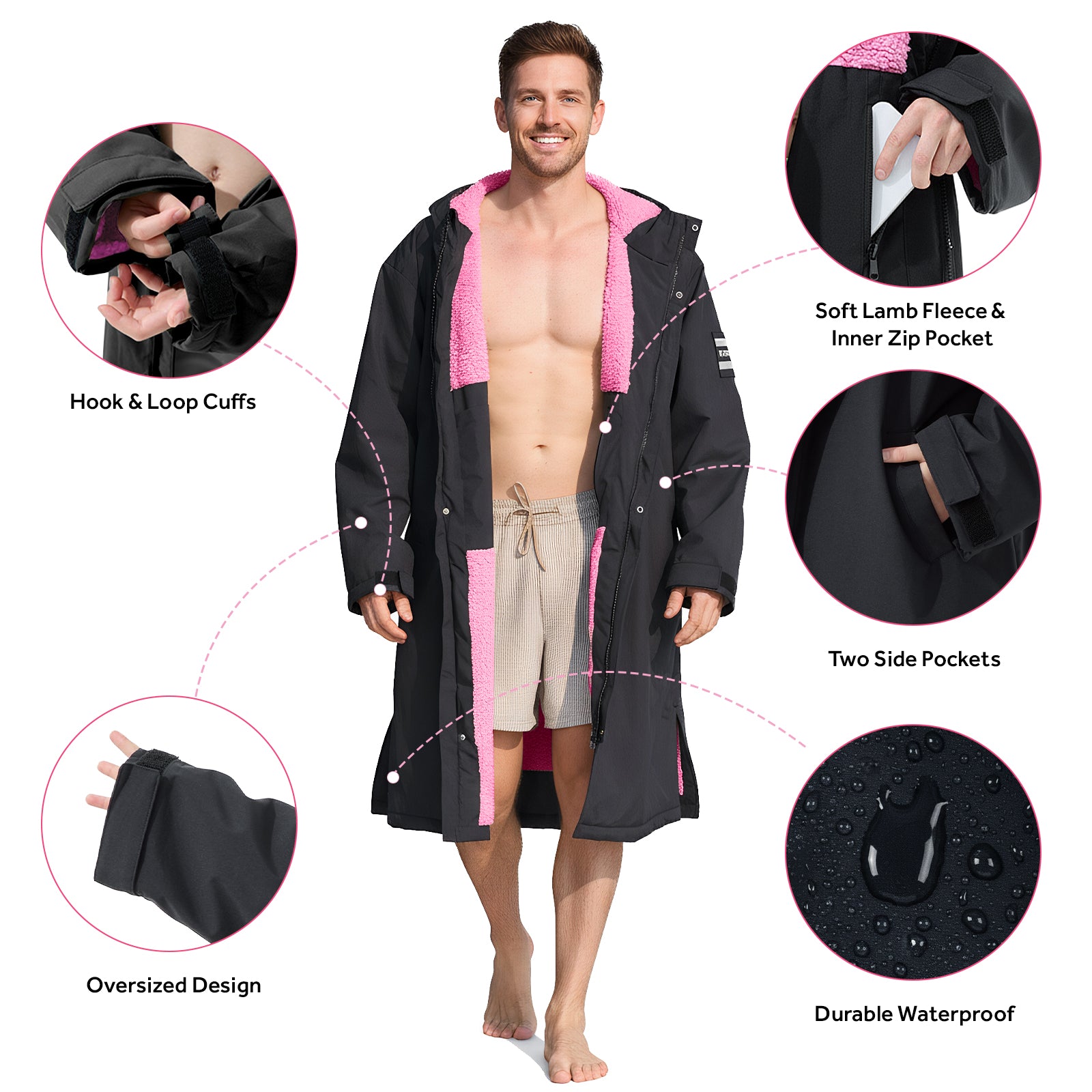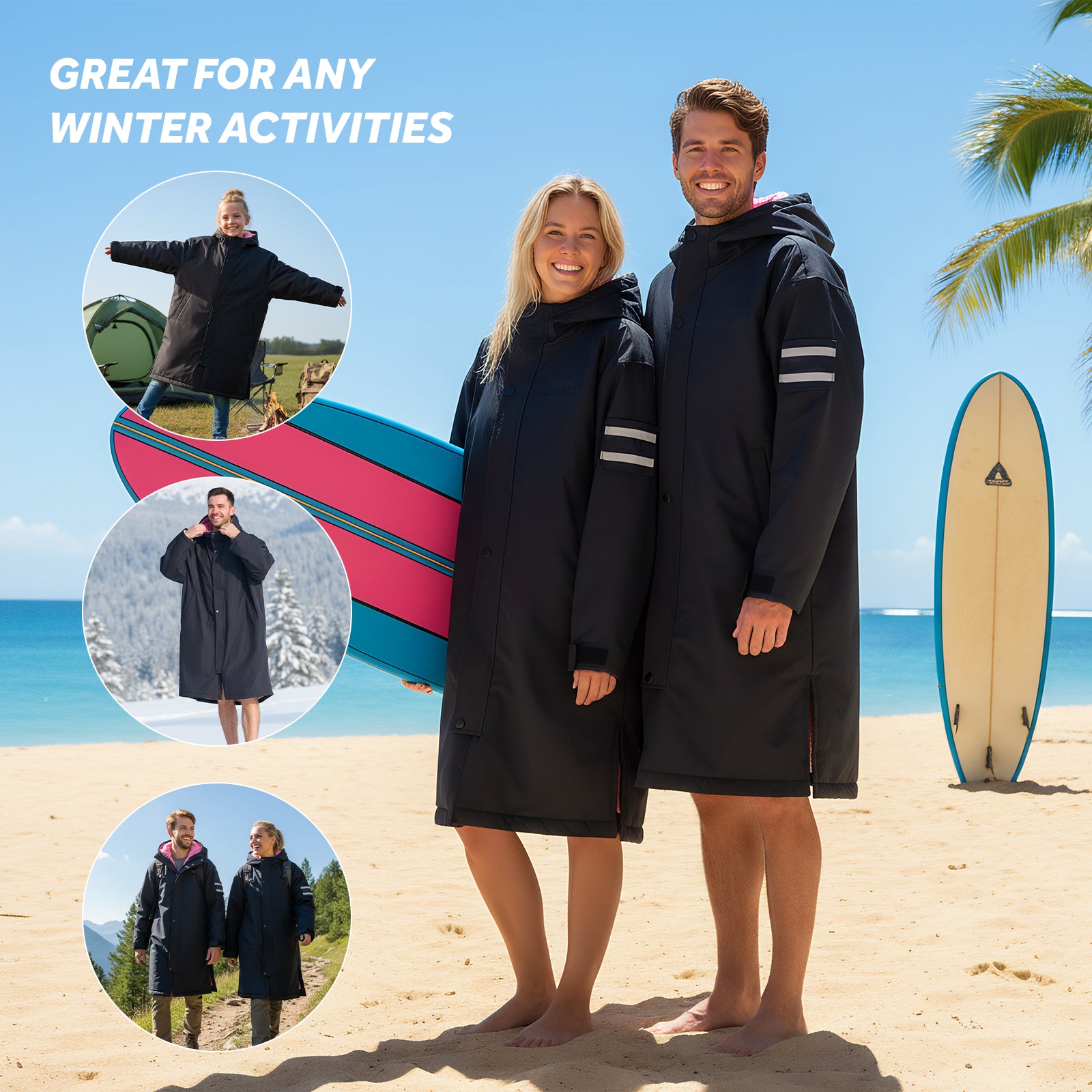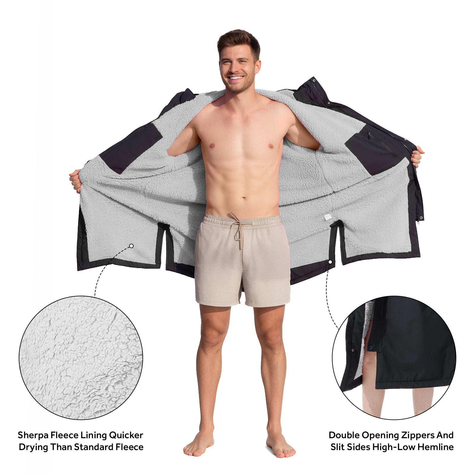 ⛱️【Premium 2-Layer Defense】:Waterproof Shell & Plush Fleece Lining. The tough waterproof polyester outer shell blocks wind and rain, while the ultra-soft, thick bubble velvet lining wraps you in instant warmth and comfort, effectively wicks moisture for a quick dry after swimming or surfing.