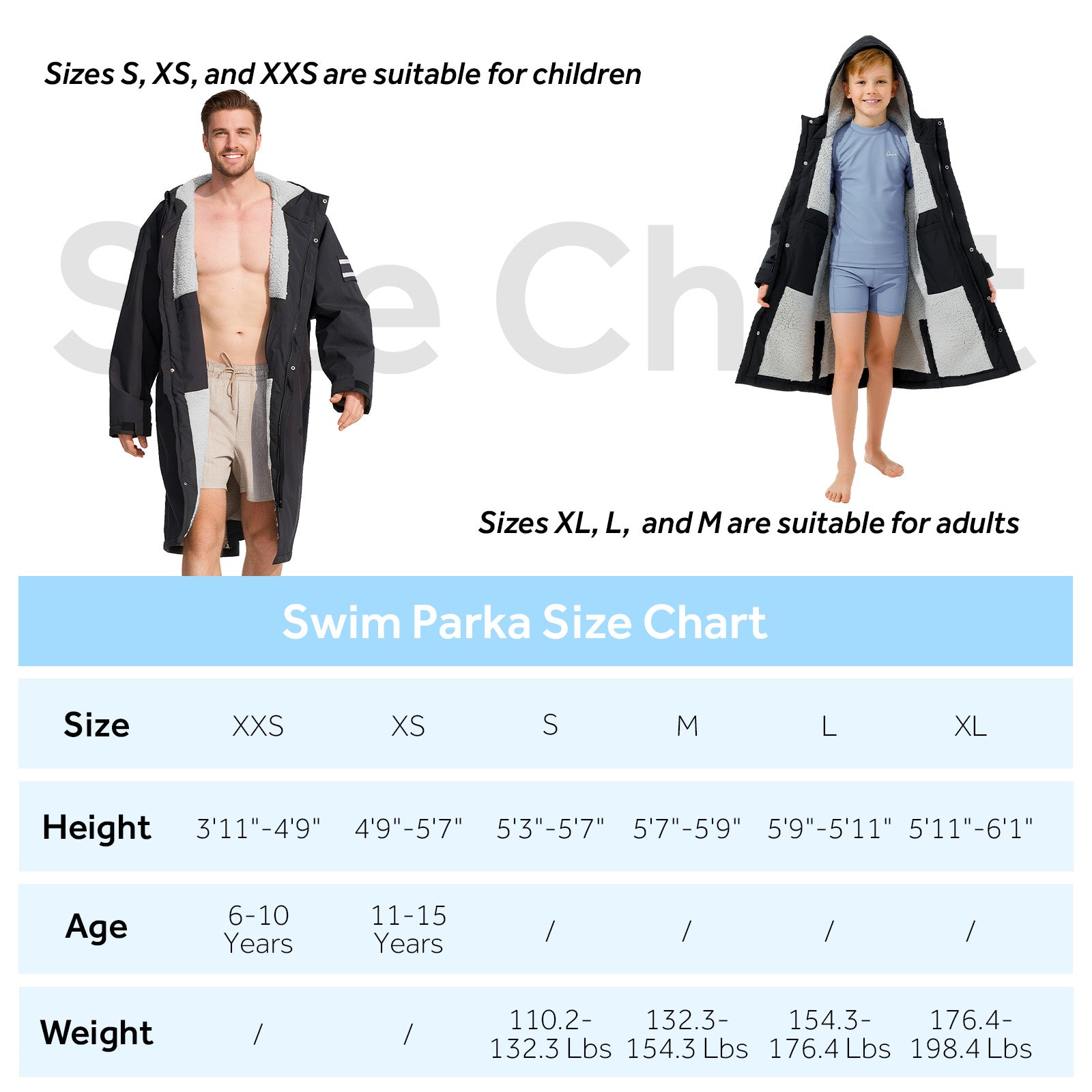 🌪️【One Versatile Parka for All】:With unisex sizing for kids, teens, and adults, this swim parkas are very suitable for outdoor sports: camping, hiking, fishing, winter running, and also suitable to use as a surf poncho on the beach, and any other water sports like swimming, diving, surfing, kayaking and etc.