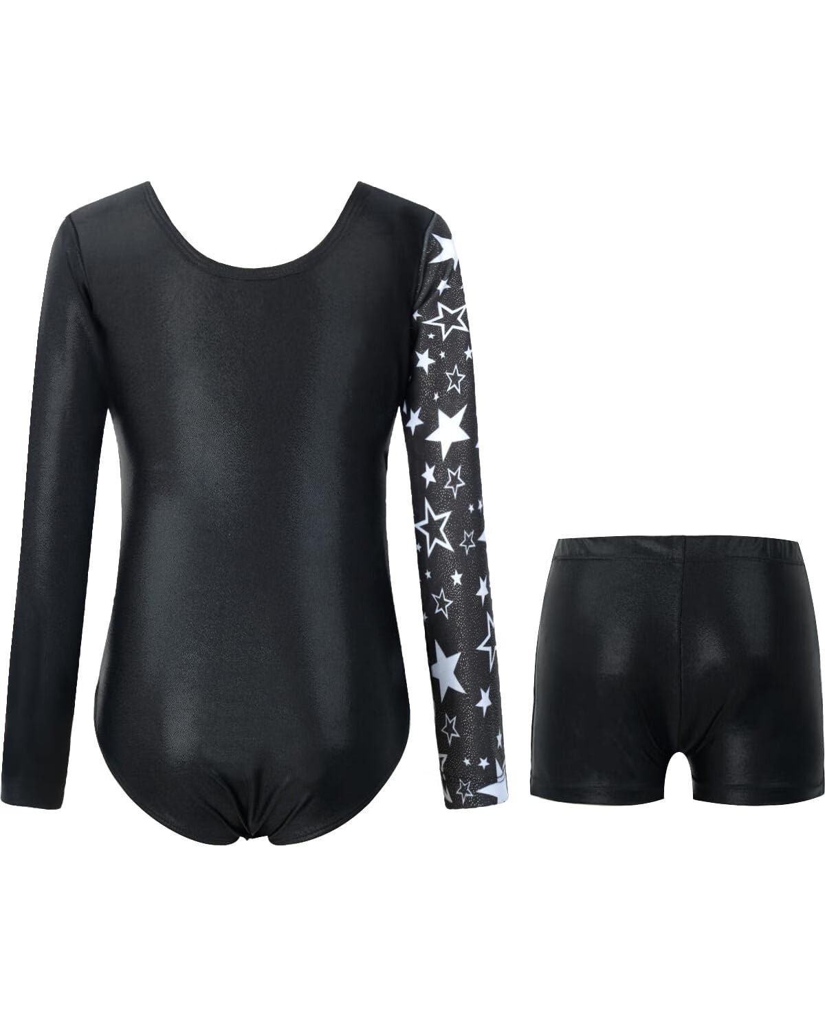 Gymnastics Leotards for Girls,Long Sleeve Rhinestone Kids Dance Unitards Biketards with Tumbling Dance Shorts