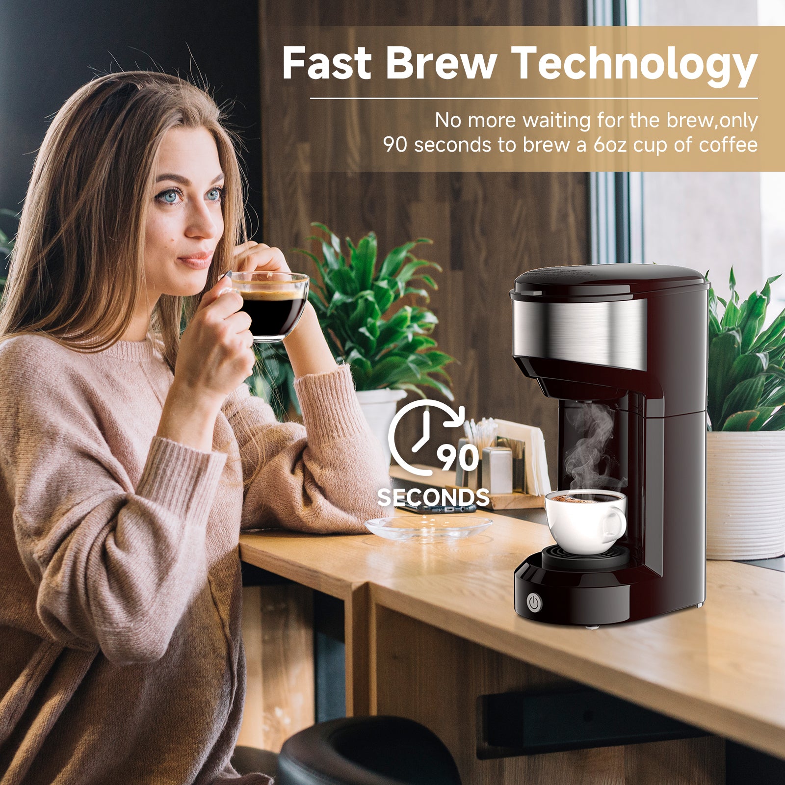 MINI Single Serve Coffee Maker, Instant Coffee Maker One Cup for K Cup & Ground Coffee, Portable Capsule Coffee Machine with 6 to 14oz Reservoir, 90 Seconds Fast Brewing and One Button Operation