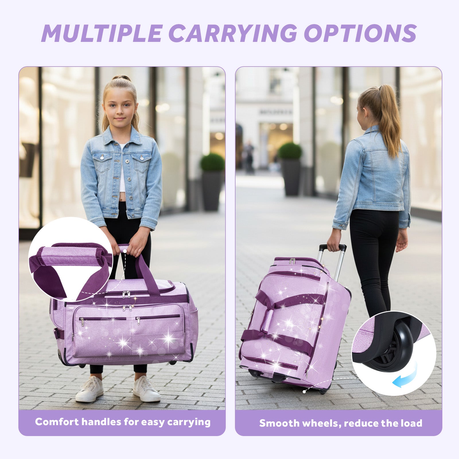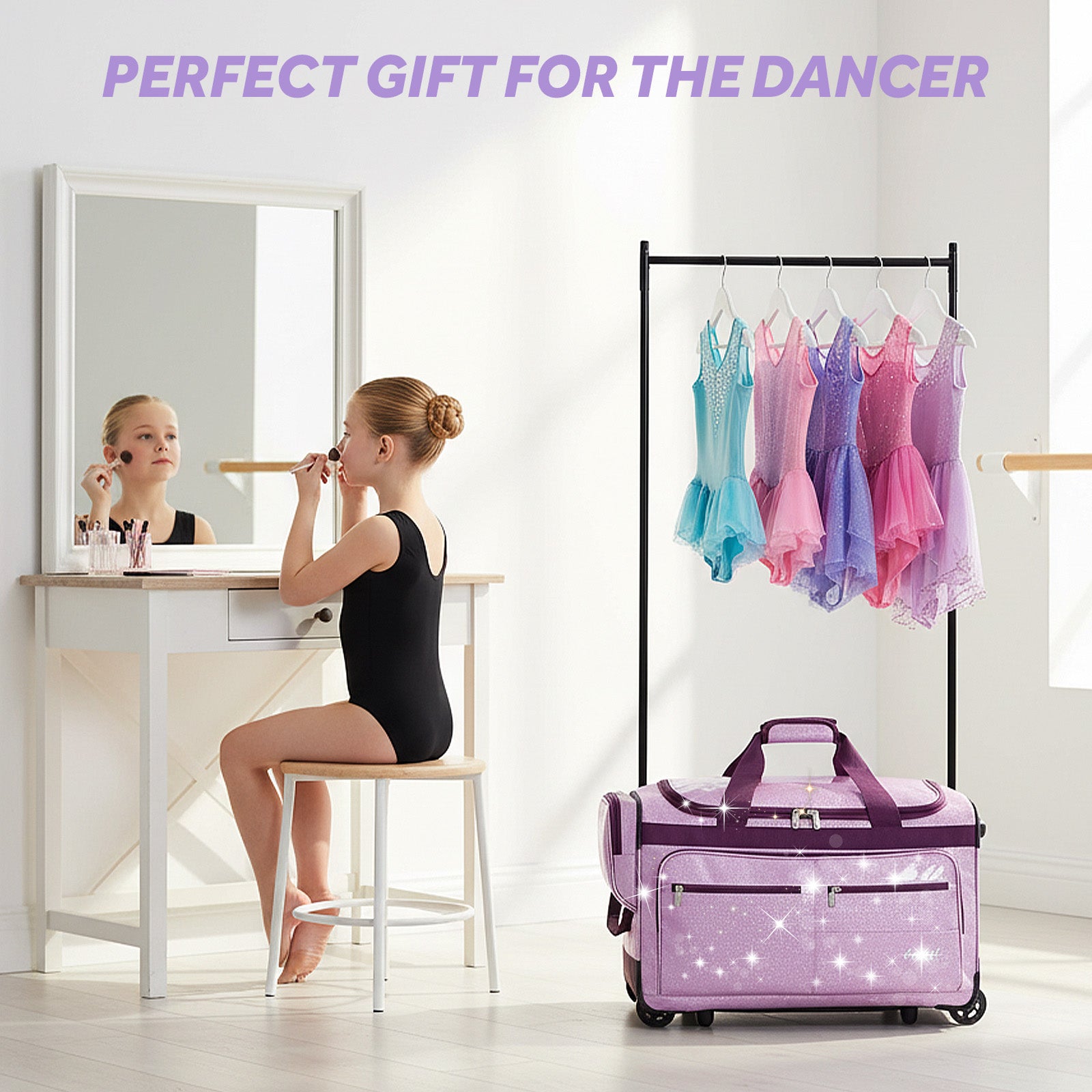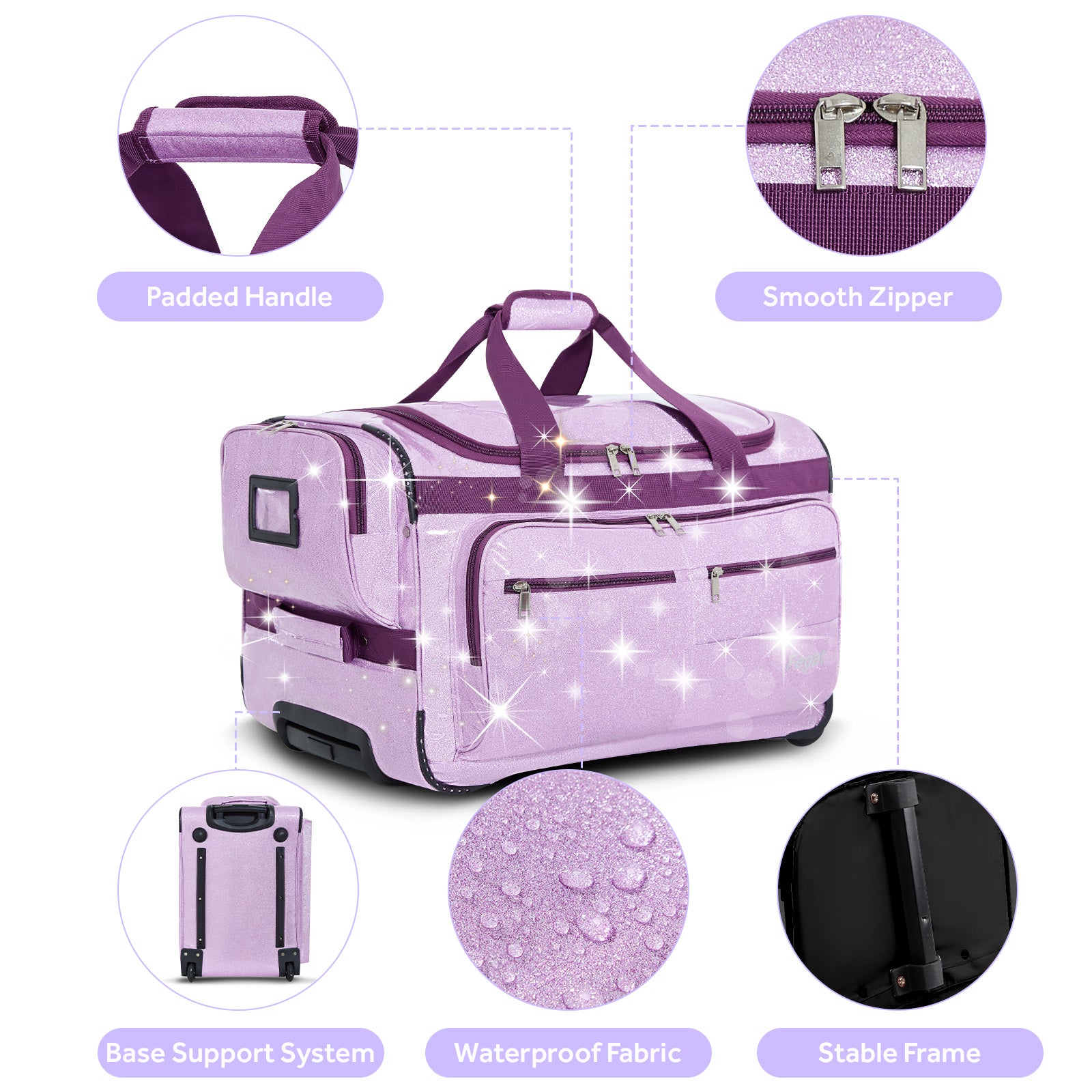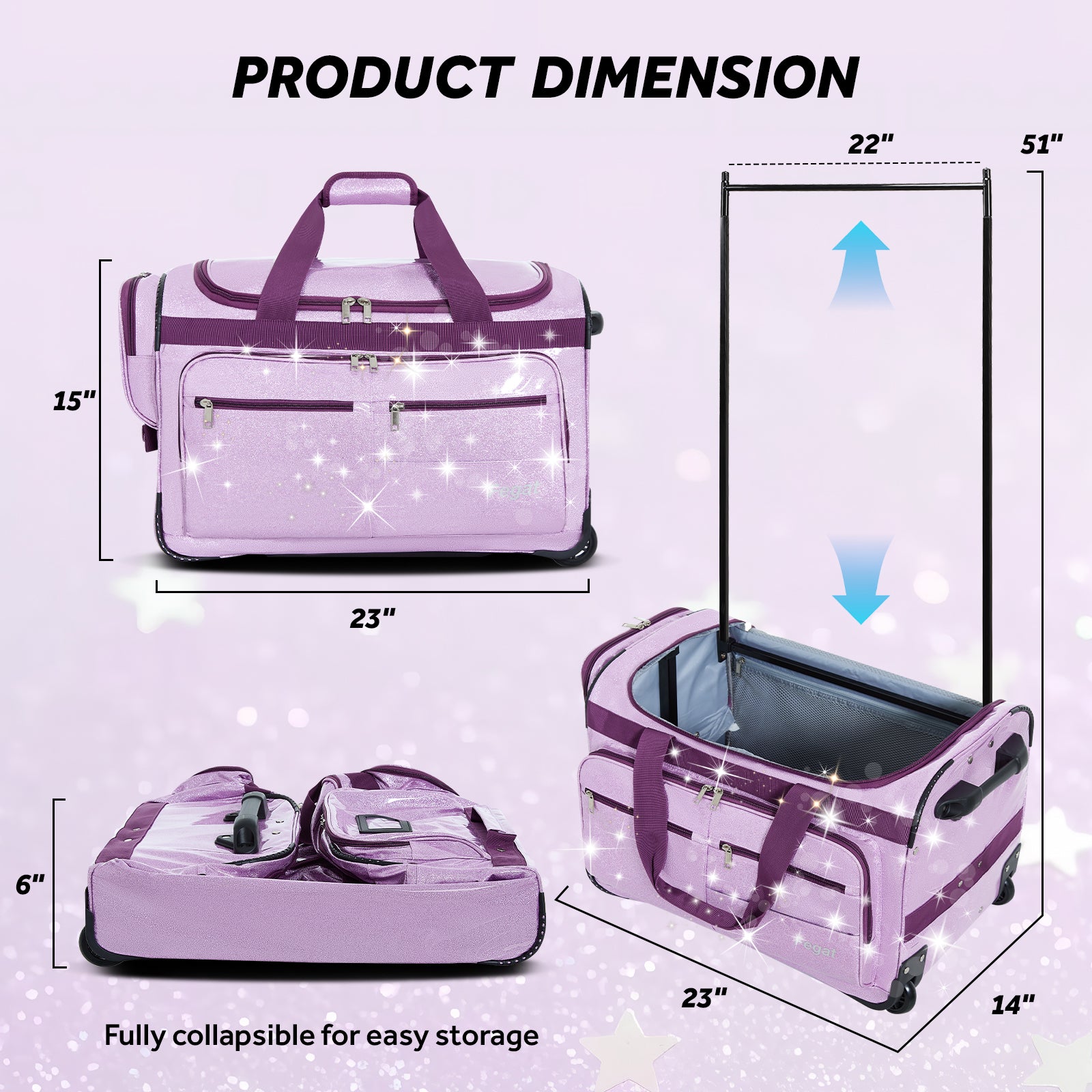 Fegat Dance Bag with Garment Rack,23"Glitter Bright Rolling Dance Duffel Bag Lightweight Competition Bag Costume Suitcase for Dancers Performer Artist, Shine Glitter Purple