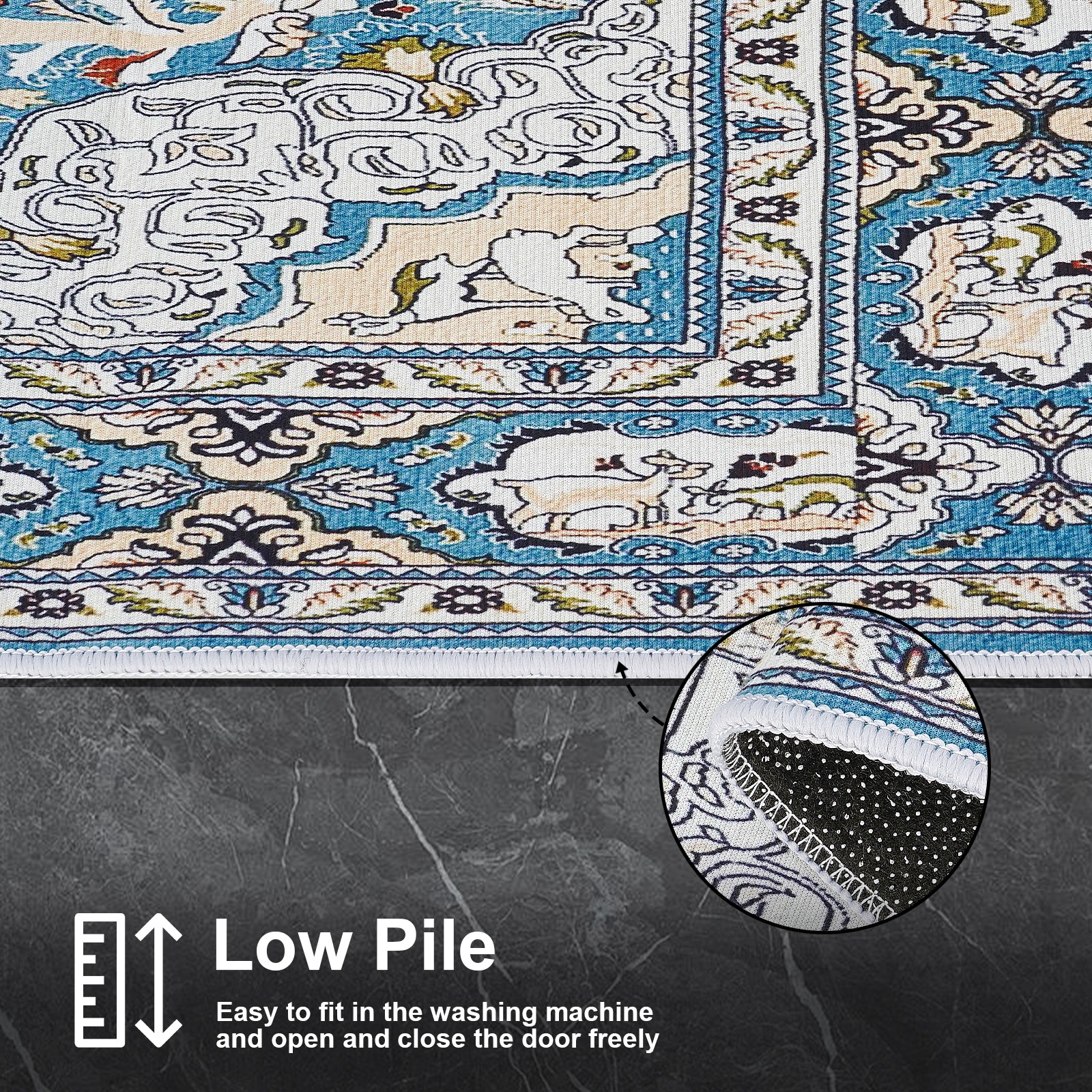 This OldPAPA area rugs has a trendy faded style and a unique floral pattern, vintage tones blend perfectly with your home. This rug is made of high-quality faux wool fibers. Easy on the feet-soft as cotton balls,stain-resistant and non-shedding. 0.27 inch low pile rug, pet dander and hair won't get trapped inside, prevents pets and children from chewing or scratching, stains and dirt are easily removed. Pets' paws won't get snagged or get caught on edges causing them to scratch floors. This ultra-thin Moroccan rug can be easily placed in entryways and under furniture, and won't get stuck on doors and become a tripping hazard. The sweeping robot can move freely to clean the carpet. This indoor rug can be used in many occasions,such as entry, living room, bedroom, dining room and more. The living room rug is made of TPR non-slip rubber backing, which helps to keep the rug in place, prevents heavy traffic from scuffing the floor. Even if running on it quickly, it not moves and slides around. The vintage rug can be machine washed, vacuumed, broom or rag cleaned. Rug fold wrappers may temporarily wrinkle, it is recommended to roll the rug in the opposite direction to give the creases time to flatten and set.